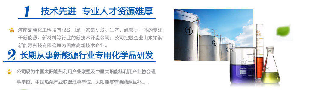 濟(jì)南鼎隆化工科技有限公司是一家集研發(fā)、生產(chǎn)、經(jīng)營于一體的專注于新能源、新材料等行業(yè)的新技術(shù)開發(fā)公司;公司控股企業(yè)山東鉑潤新能源科技有限公司為國家高新技術(shù)企業(yè)。擁有雄厚的科研實(shí)力和專業(yè)銷售隊(duì)伍以及多名從事化學(xué)化工專業(yè)的高素質(zhì)人員,其中博士生導(dǎo)師1人,碩士研究生3人。公司現(xiàn)為中國太陽能熱利用產(chǎn)業(yè)聯(lián)盟及中國太陽能熱利用產(chǎn)業(yè)協(xié)會理事單位、中國熱泵產(chǎn)業(yè)聯(lián)盟理事單位、山東清潔能源供暖產(chǎn)業(yè)聯(lián)盟理事單位、太陽能與輔助能源互補(bǔ)供熱/制冷工程專業(yè)委員會會員單位。公司專注于綠色科技,專業(yè)化研發(fā)環(huán)境友好型化工產(chǎn)品,與眾多高校和國內(nèi)外多家著名化學(xué)品公司保持戰(zhàn)略合作關(guān)系。公司擁有“載能”和“澤能”...更多